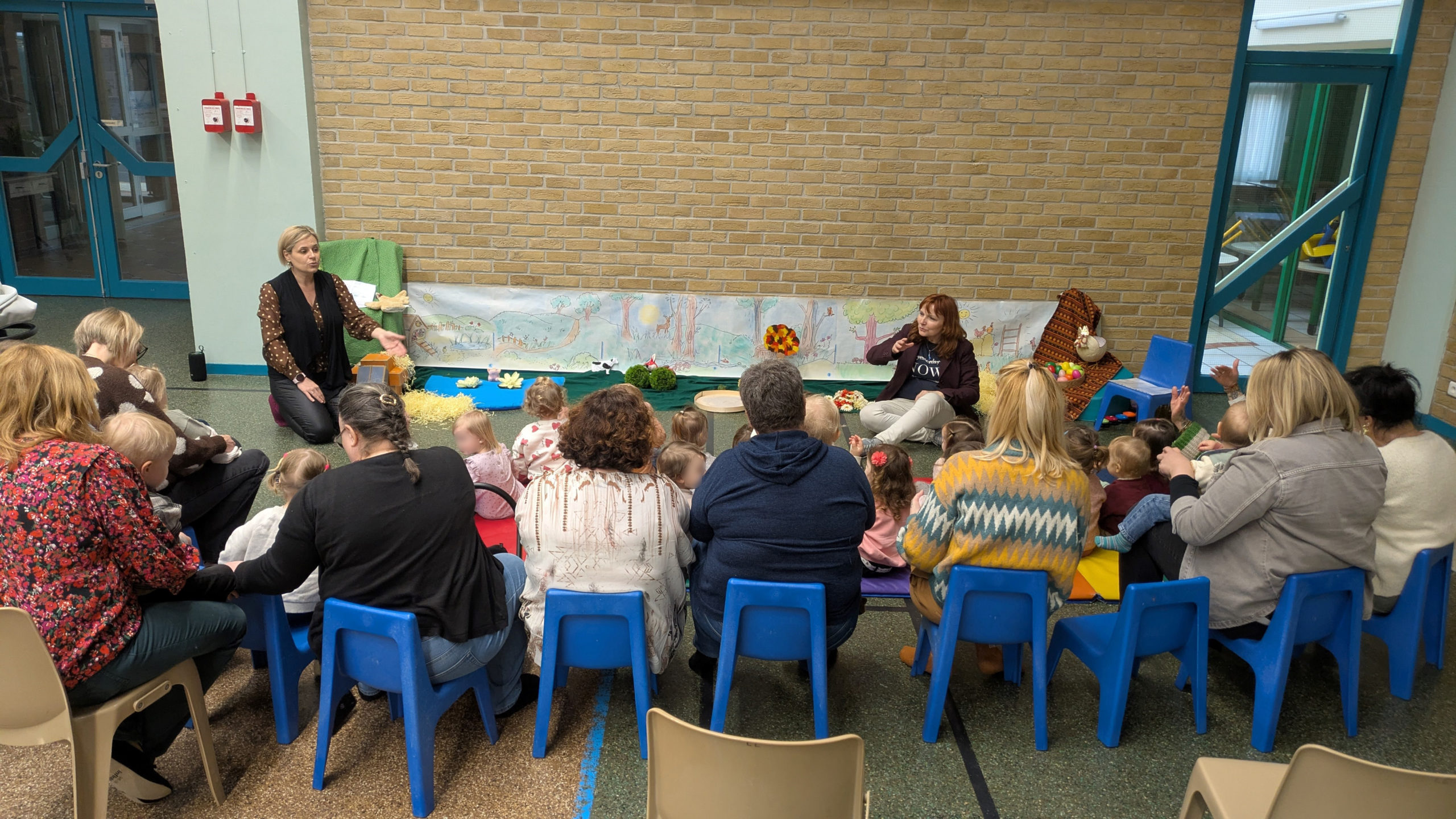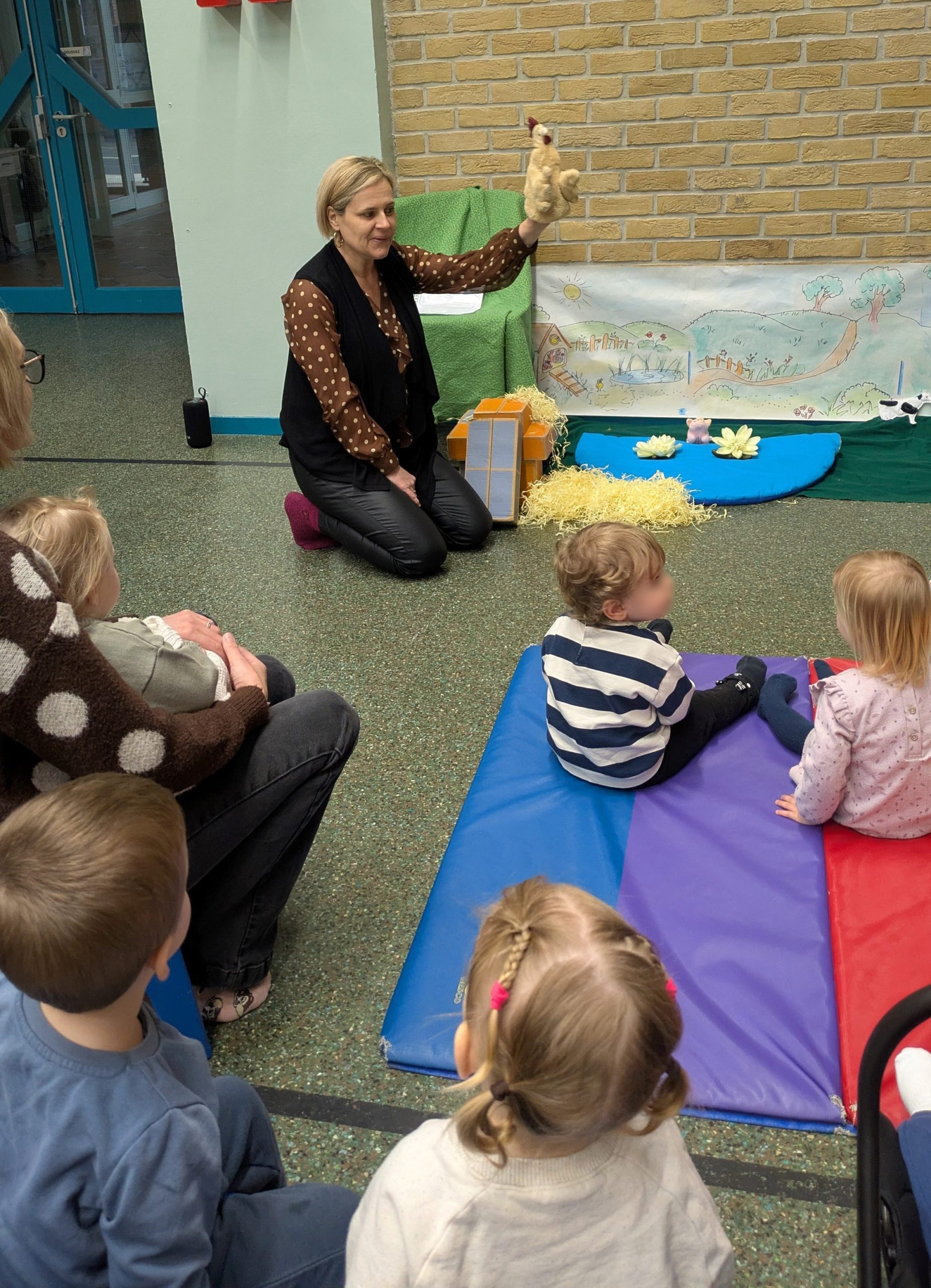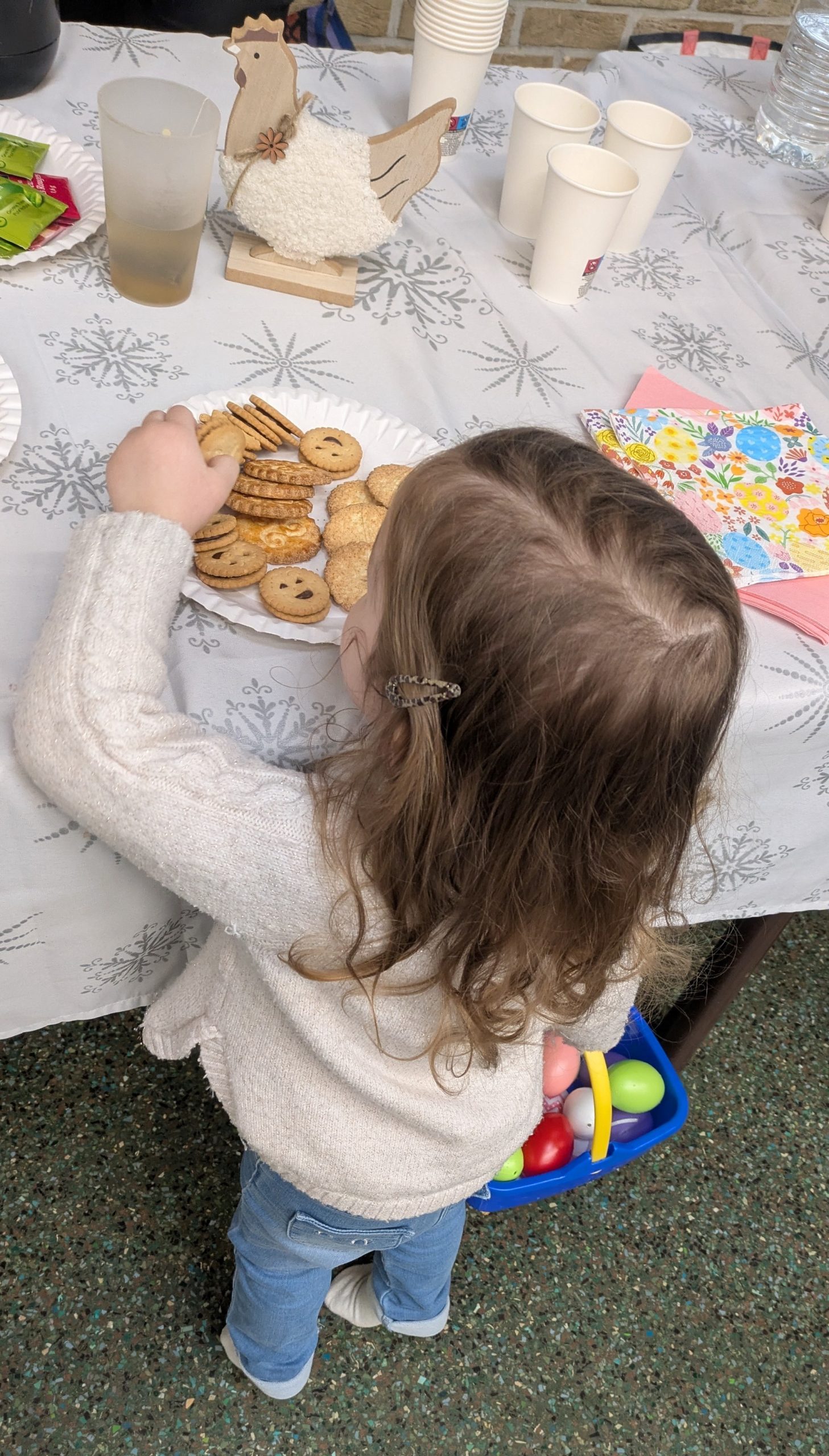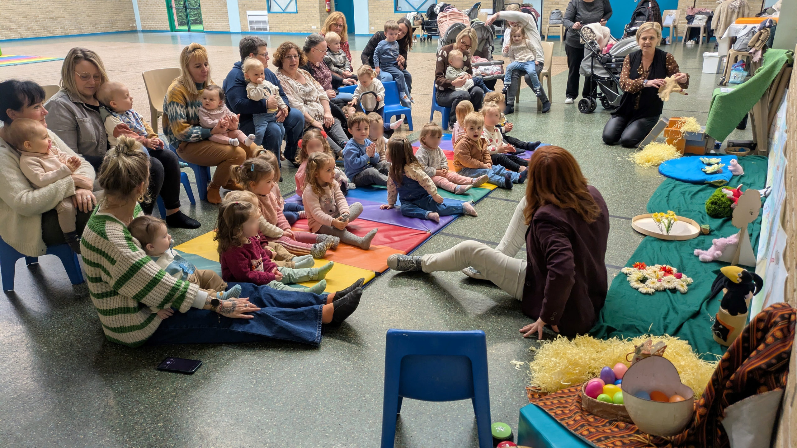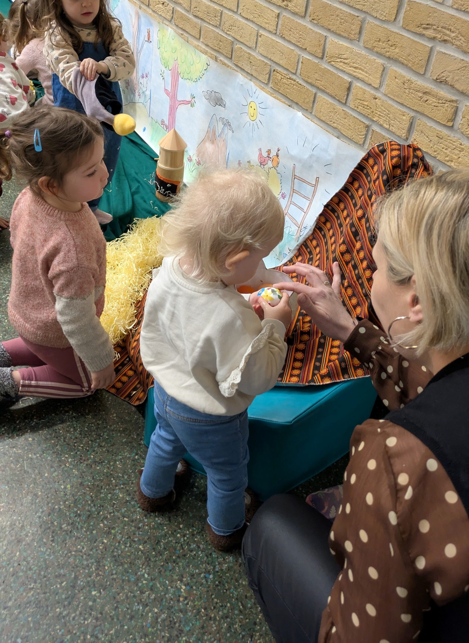 Après avoir assisté aux aventures extraordinaires de Codette la poulette qui tentait de retrouver son œuf merveilleux, la peluche gallinacée a invité les 26 enfants présents et leurs assistantes maternelles à prendre part à leur propre chasse à l’œuf à l’extérieur..